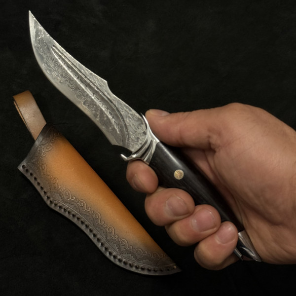 Агресивен японски ловен нож NIKASHI SHARK DAMASKUS, дамаска стомана VG10/96 слоя, дръжка махагон, кожена кания