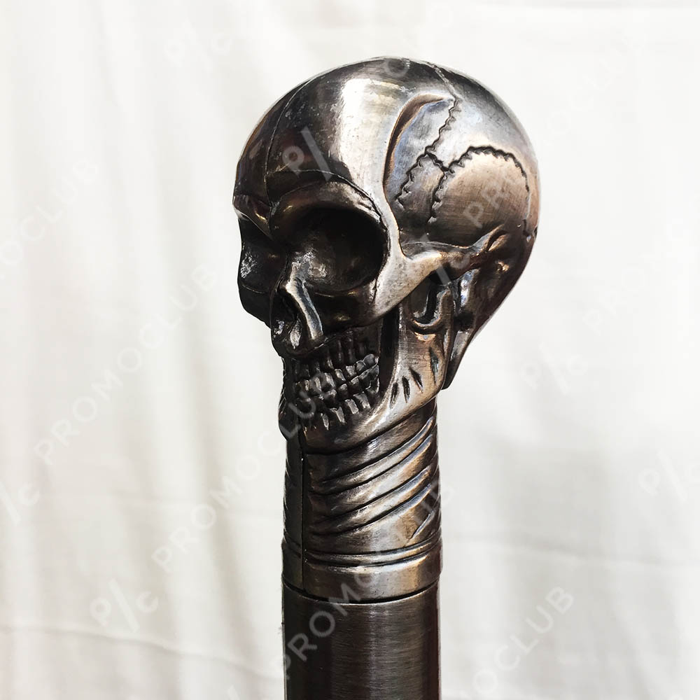 Великолепен (висок клас реплика) кух бастун с кинжал по традиционен британски модел, но с модерна дръжка МЕТАЛЕН ГОТИЧЕСКИ ЧЕРЕП. Исторически, моделът бастун с куче е един от първите появили се непосредствено след Френската Революция. Конкретният модел, в частта ръкохватка е реплика на модел от средата на 19 ти век - Великобритания. Размери - бастун, с обща дължина около 1 ярд (92 см), със стоманено конусовидно тяло с диаметри 45 мм /19 мм. Стабилен, много здрав - сам по себе си сериозно оръжие.