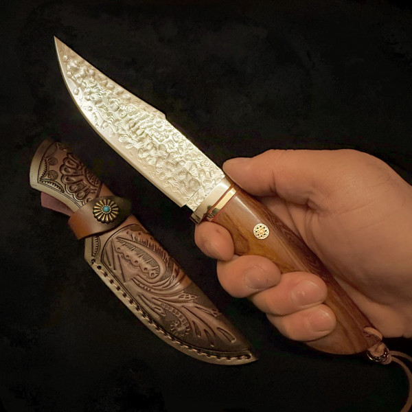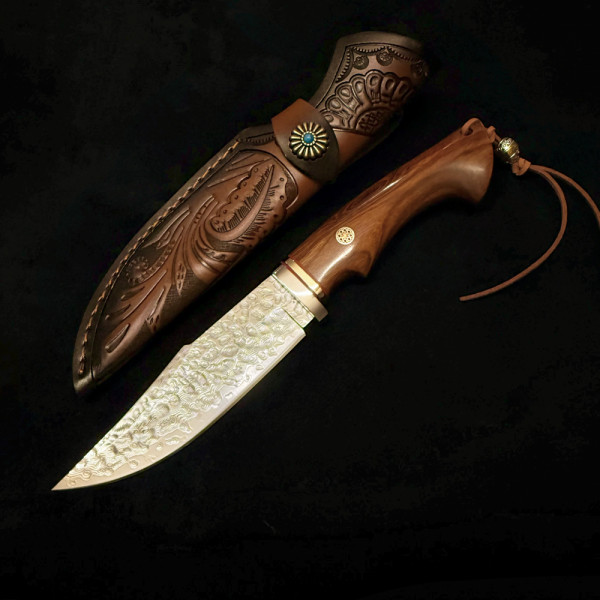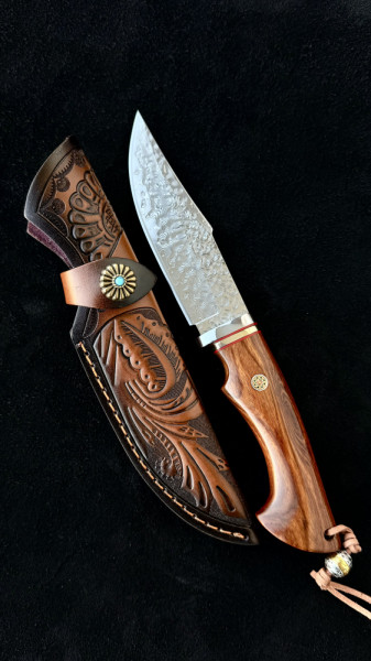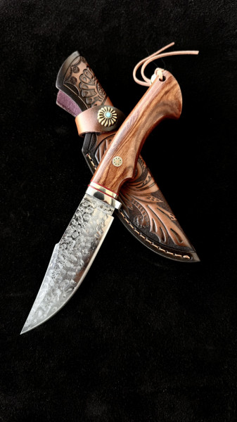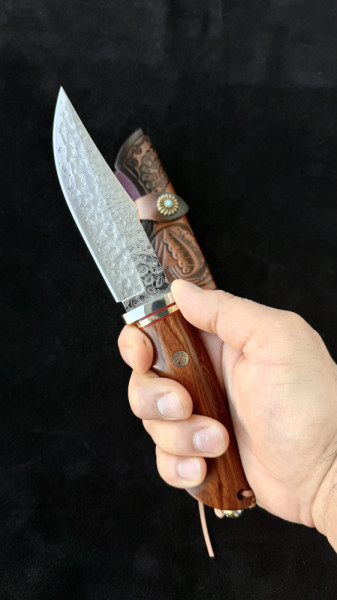 Немски ловен нож Der HUNT 626 DAMASKUS, стомана VG10 67 слоя, дръжка орех, кожена кания