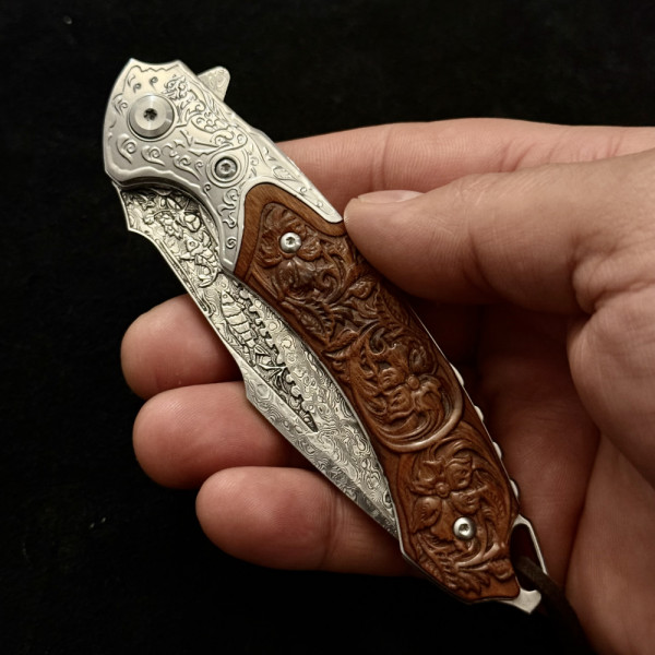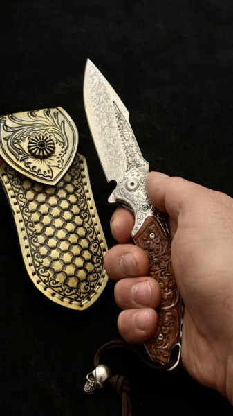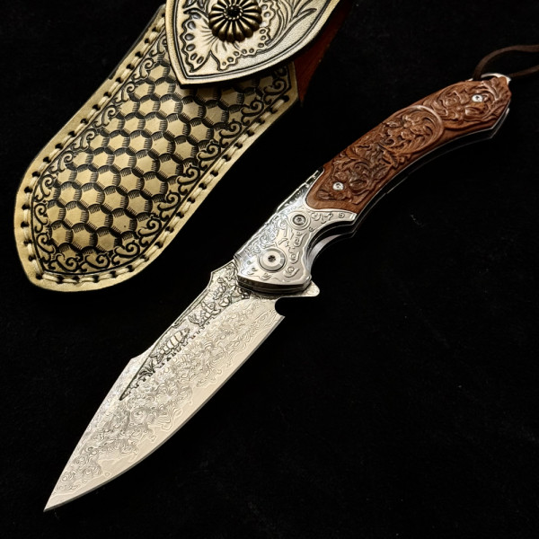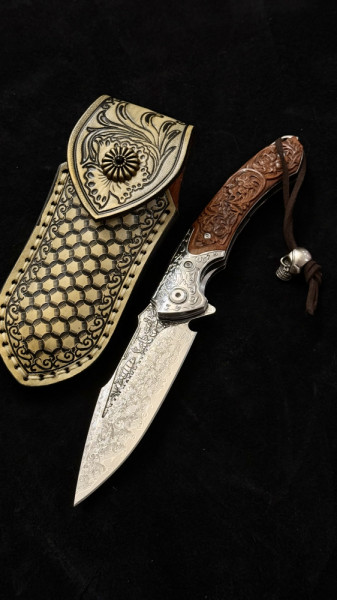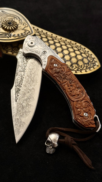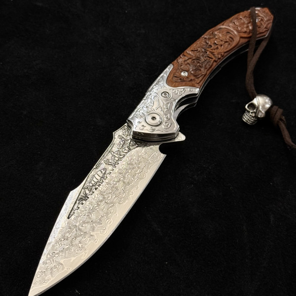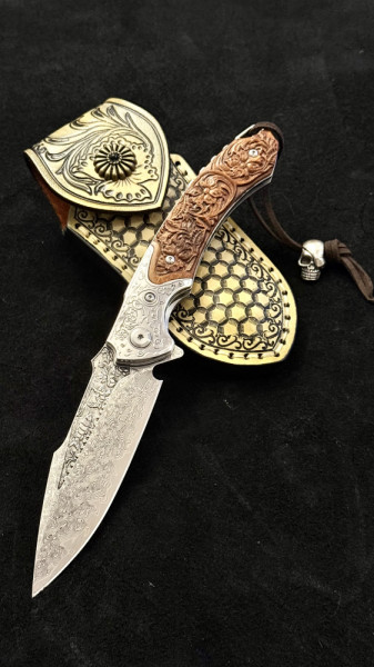 Полуавтоматичен сгъваем ТОП нож JAP SKULL DAMASKUS МК-17 с палец за отваряне, стомана VG10 damask, дръжка от гравиран махагон, кобур