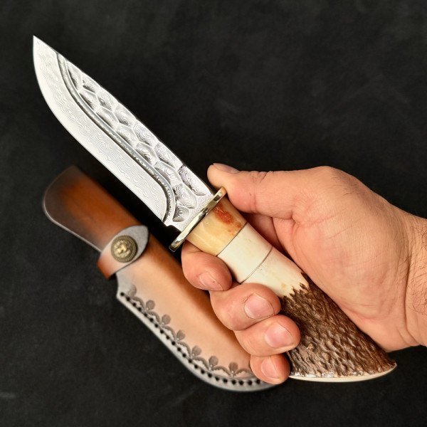 Премум модел немски ловен нож Der HUNT 677 DEER DAMASKUS, стомана VG10 67 слоя, дръжка Рог, кожена кания телешки бланк