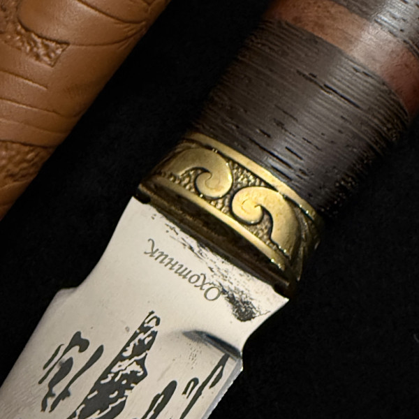 Руски ловен нож ОХОТНИК ВОЛК, стомана 65х13, кожена кания, дръжка орех и венге