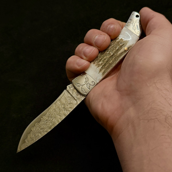 Сгъваем немски ловен нож Der HUNT МК-12 DEER, дамаска стомана VG10/69L, седефена дръжка