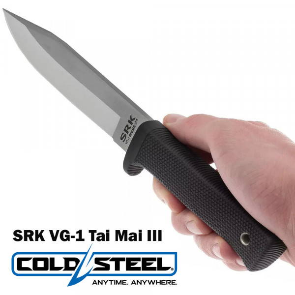 Cold Steel SRK е много солиден и здрав фиксиран нож. SRK означава Нож за търсене и спасяване. Този универсален нож за оцеляване никога няма да ви разочарова. Стоманеното острие VG-1 San Mai III е голямо момче със своите 5 мм ширина. С тънко заточеното си острие той реже като никой друг. Има страхотен баланс между характеристиките на рязане и твърдост. Дръжката на Kray-Ex предлага страхотен захват дори при мокри условия.