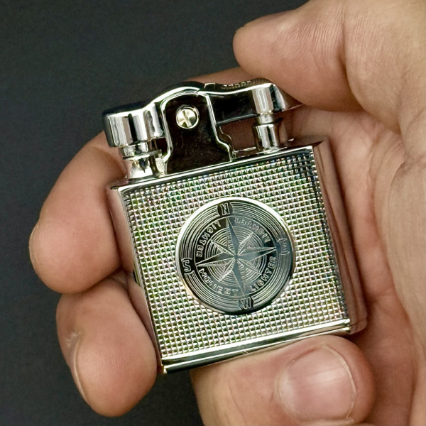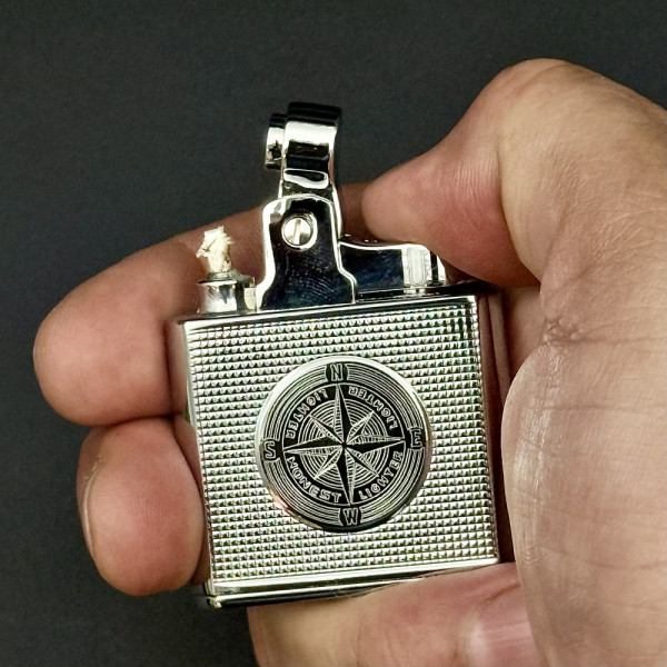 🧭 Елегантен дизайн с гравиран компас. Изисканата гравюра придава стилен и отличителен характер на запалката. Нежно и компактно тяло, фини линии.