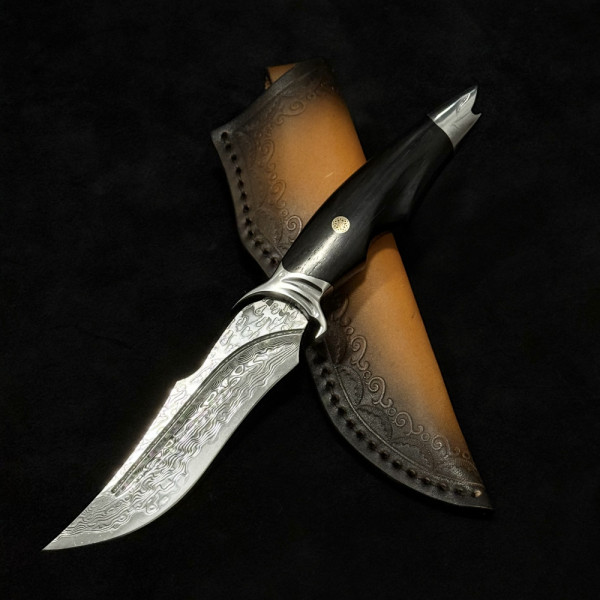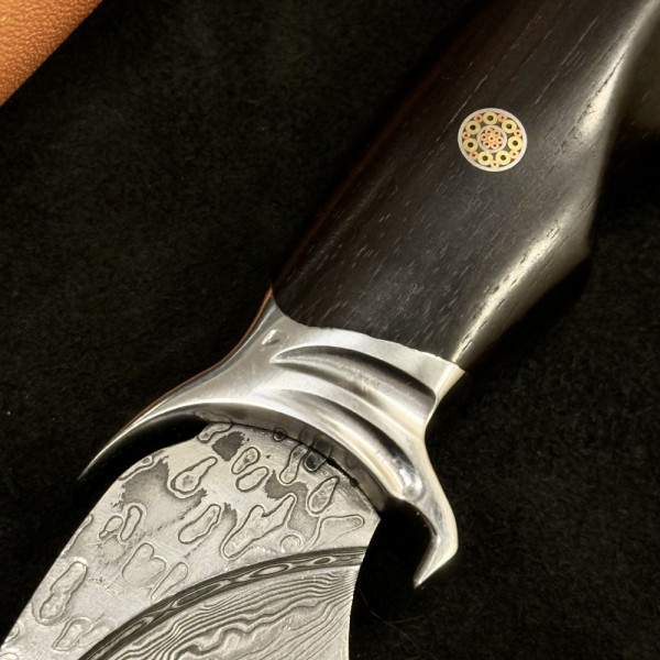 Агресивен японски ловен нож NIKASHI SHARK DAMASKUS, дамаска стомана VG10/96 слоя, дръжка махагон, кожена кания