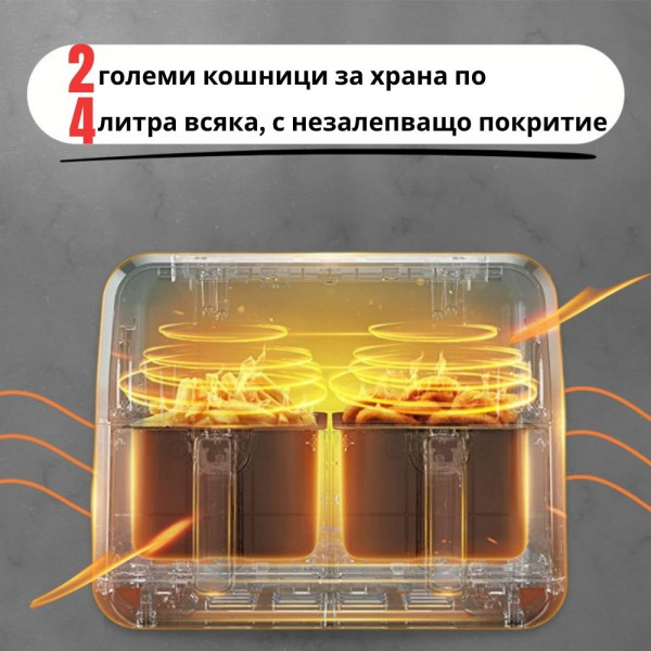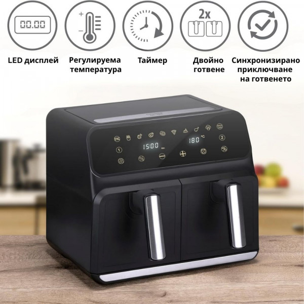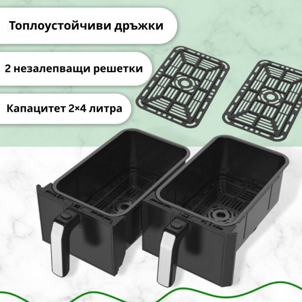 XXL Airfryer 8L с двойна кошница – 1700W, 8-в-1, без пържене с олио + подарък КНИГА със 170 рецепти, съобразени с точните програми на уреда. Рецепти за двете кошници.