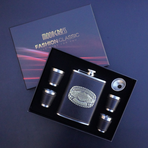 Елегантен подаръчен комплект за мъж с метална, облепена с кожа манерка с метално лого на Harley-Davidson и четири метални облепени с кожа шот чаши и малка метална фунийка за сипване.