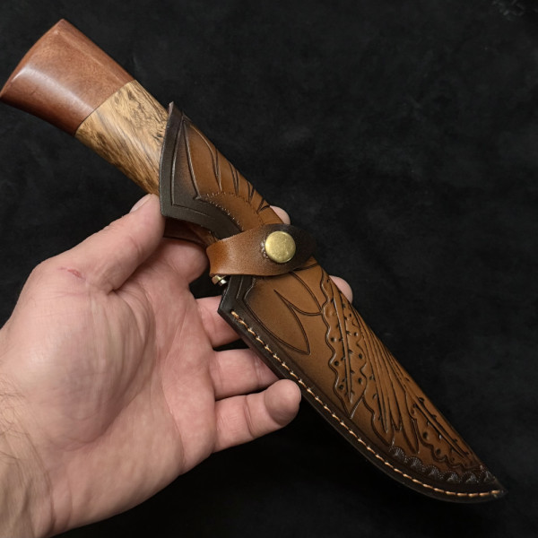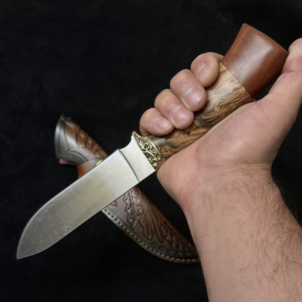 Голям руски ловен нож ВОЛК, стомана 65х13, кожена кания, дръжка орех и стабилизиран тумор