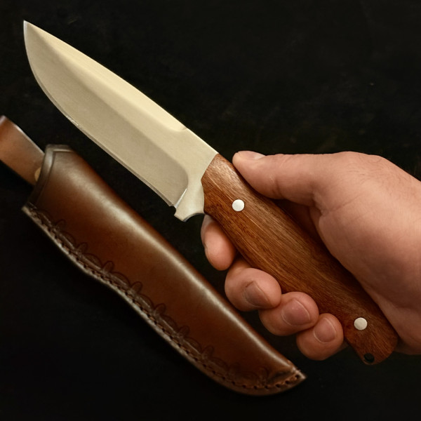 Изчистен немски ловен нож Der HUNT 321 CHERRY, фултанг стомана 5Cr13Mov, дръжка череша, кожена кания
