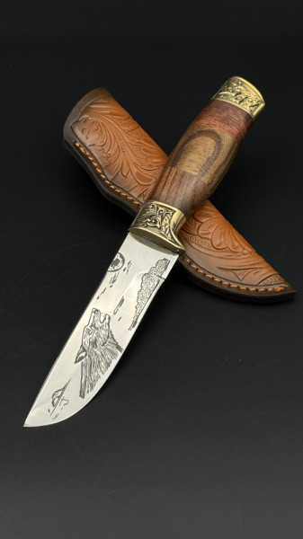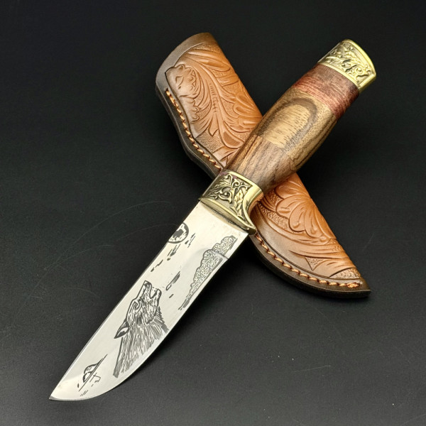 Класически ловен нож DER HUNT WOLF, стомана 65x13, 56 HRc, махагон и месинг, телешка кания