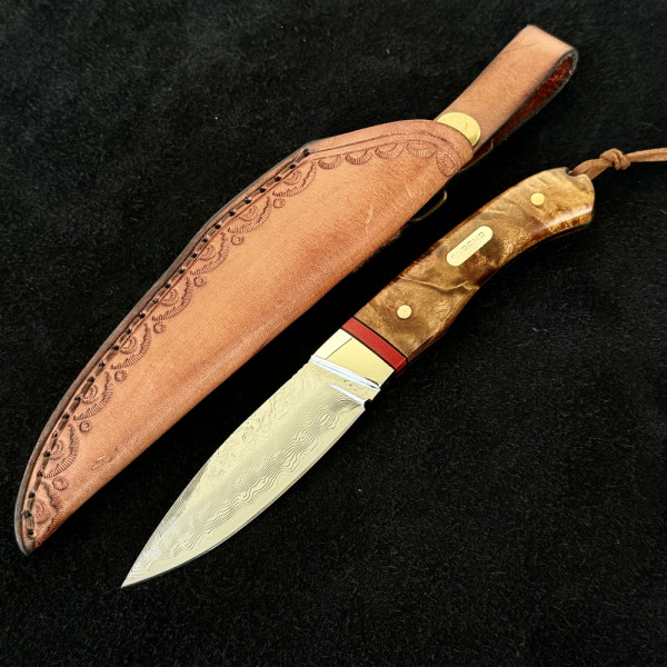 Компактен японски ловен нож CLRENR DAMASKUS, фултанг дамаска стомана VG10 69 слоя, дръжка орех и месинг, кожена кания