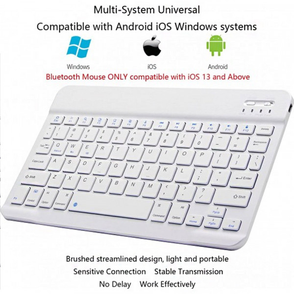 Bluetooth връзка: Клавиатурата и мишката приемат стабилна Bluetooth технология, работното разстояние е до 10 метра. Клавиатурата е с US QWERTY оформление, лесна за сдвояване и използване, има клавишни комбинации, като контрол на звука, възпроизвеждане и пауза, предишен и следващ и т.н. Предната част е изчеткана, задната е с ултратънък и гладък дизайн от алуминиева сплав.