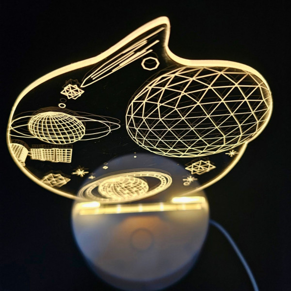 Тази уникална 3D LED лампа с космически дизайн създава впечатляващ ефект на дълбочина и светлина. Гравираните планети, орбити и космически елементи се осветяват от LED основата и изглеждат като триизмерна галактика, която сякаш се носи във въздуха.