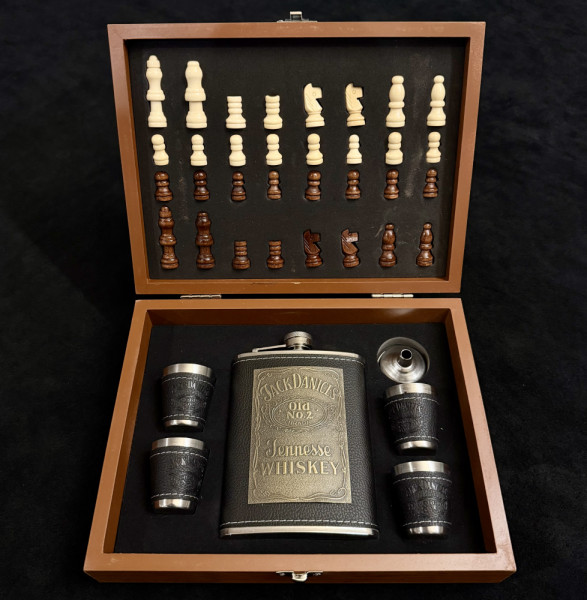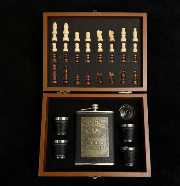 Луксозен дървен шах комплект Jack Daniel's - дървен кутия-дъска, манерка и 4 чаши