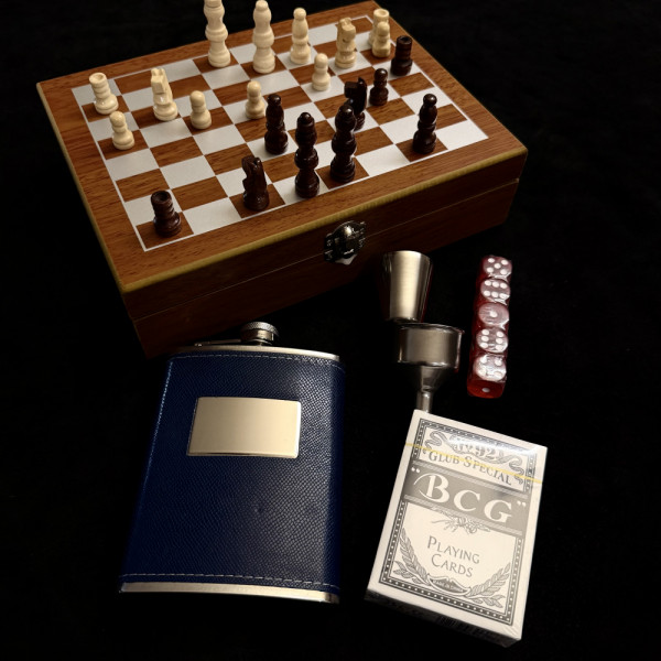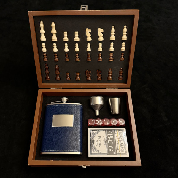 Луксозен подарък: шах комплект с дървена дъска- кутия заедно със стоманена манерка и чашка, тесте с карти за игра и комплект зарове