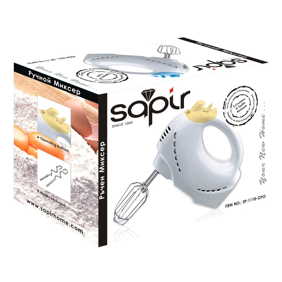 Ръчен миксер SAPIR разполага с мотор с 5 скорости + турбо функция, благодарение на които ще можеш да миксираш и разбиваш безпроблемно всякакви смеси - от по-меки до по-твърди. Удобната дръжка ти дава необходимия комфорт по време на готвене, а бъркалките са лесни за почистване. Той ще стане най-добрият ти помощник, с който ще правиш всякакви кулинарни вълшебства.