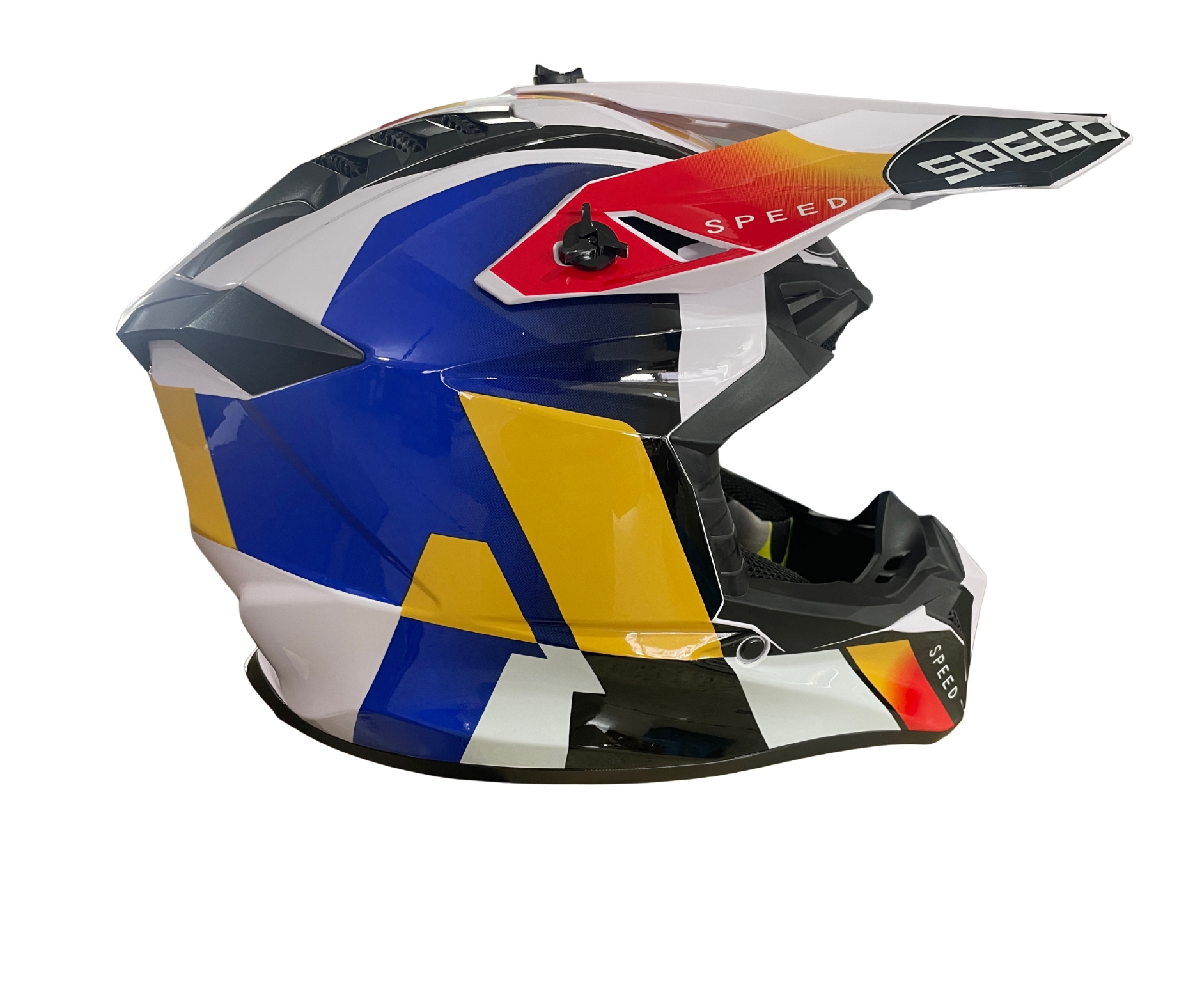 Моделът е с агресивен спортен дизайн в бяло с жълто-сини графики, които осигуряват отлична визия и добра видимост.