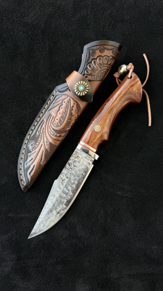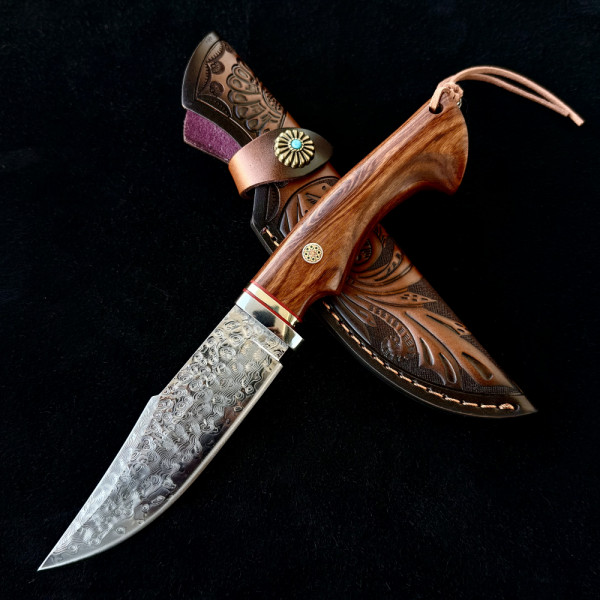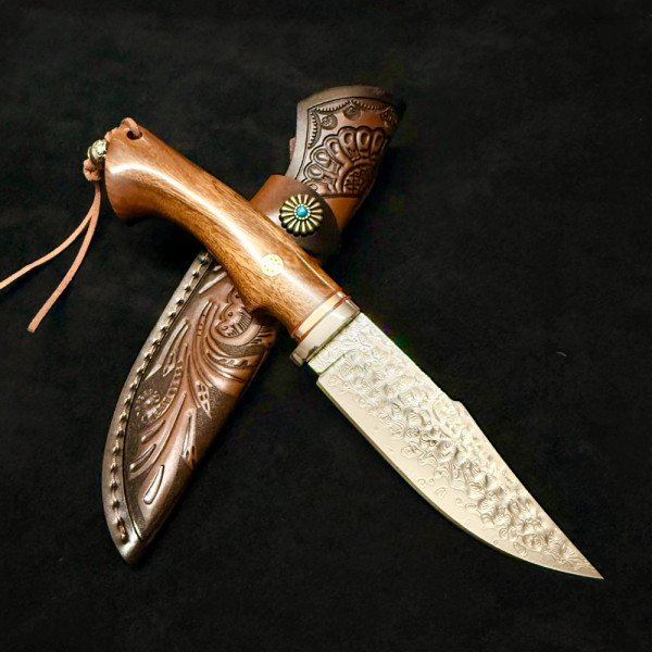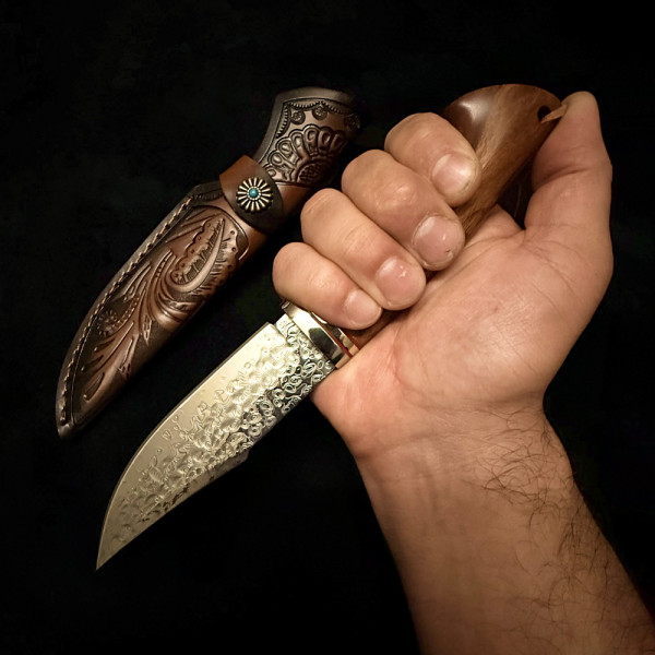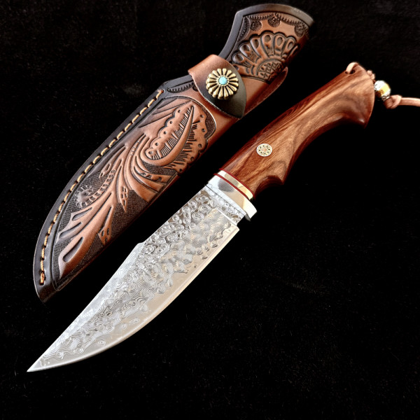 Немски ловен нож Der HUNT 626 DAMASKUS, стомана VG10 67 слоя, дръжка орех, кожена кания