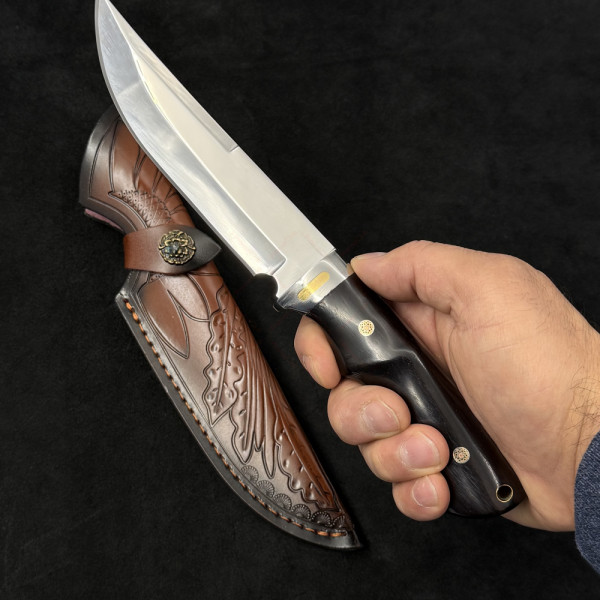 Огромен ловен нож DER HUNT 756, фултанг стомана 9Cr13Mov, дръжка махагон, гард стомана и месинг, кожена кания