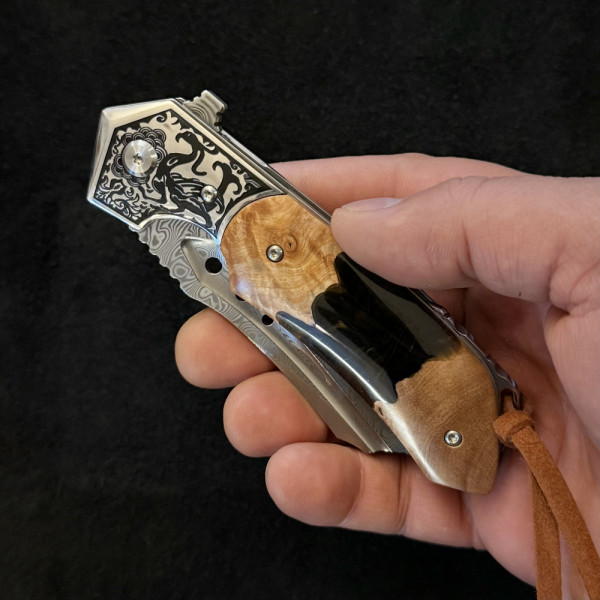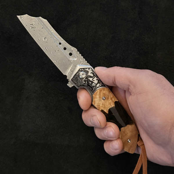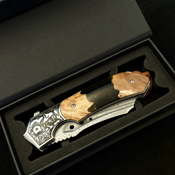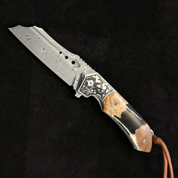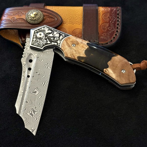 Полуавтоматичен сгъваем ТОП нож JAP SPIDER DAMASKUS МК-16 с палец за отваряне,стомана VG10 damask, дръжка маслина и смола, кожен кобур