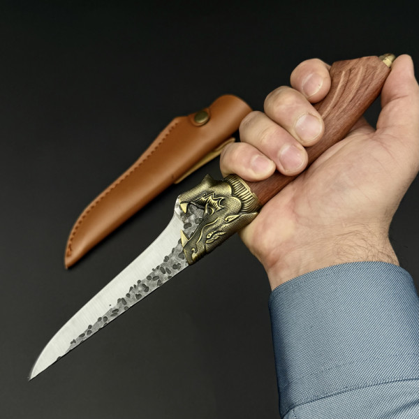 Прав кухненски нож BONER DRAGON, за обезкостяване, стомана 5Cr13Mov, дръжка розово дърво и месингов DRAGON гард