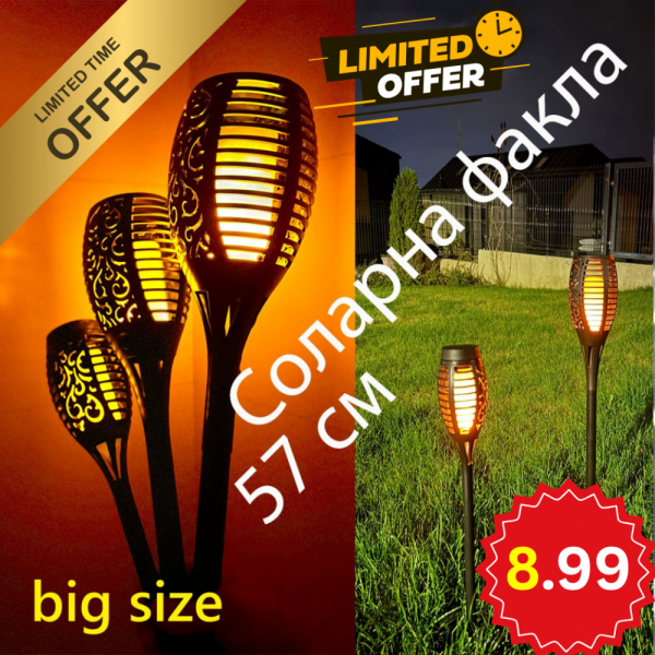 Средна соларна лампа тип факла с ефект на пламък, градиснко осветление, височина 57 см.