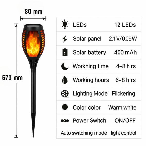 Фенерът е изработен от ABS материал и е много устойчив на износване и температурни колебания. Лампата работи благодарение на слънчевия панел. Светодиодите са програмирани с интелигентен алгоритъм, който ги задейства в двойки, това води до ефект на горене. Лампата е устойчива на атмосферни влияния и работи през цялата нощ. Продуктът е идеален за монтиране на алеи, стълби, врати за вътрешни дворове, огради, дворове. Изключително гъвкав монтажа.