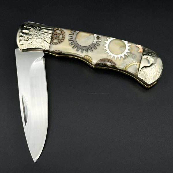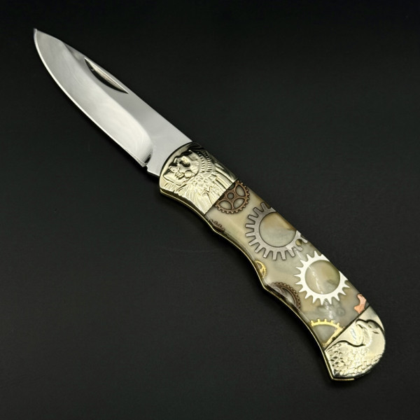 Светещ сгъваем немски ловен нож SHAMAN МК-8, стомана 5Cr13, гравиран месинг и светещи полимерни чирени
