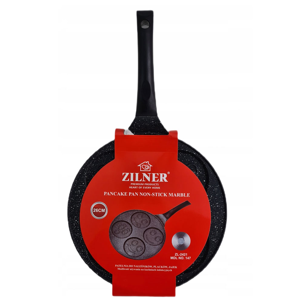 Тиган ZILNER със 4 форми на усмихнати лица е идеалният съд за една забавна и различна закуска. Мраморното му покритие се характеризира с много висока устойчивост на абразия и залепване, не реагира с храната, което прави храната по-здравословна и вкусна. Дъното на тигана има отлична топлопроводимост, което спестява много енергия.