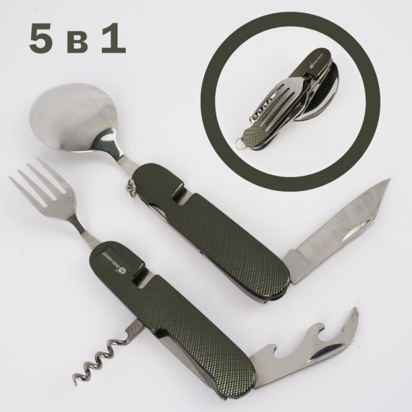 Удобен, преносим уред за хранене 5 в 1 - вилица, лъжица, нож и два вида отварачки с калъф за съхранение.