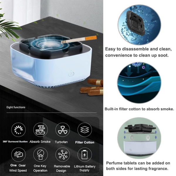 Ефективна система за филтриране - Пепелника е проектиран с 360-градусова технология за абсорбиране на дима, осигуряваща ефективно почистване на въздуха около вас. Освен тази технология, електрическият пепелник филтрира въздуха и премахва отрицателните йони, съдействайки за създаването на чиста и свежа обстановка. Със своята функция за 360-градусово абсорбиране на дима и вградения филтър, може да премахне дима около вас и да подобри качеството на въздуха, като генерира отрицателни йони. Благодарение на комбинацията от 360-градусовата технология за абсорбиране и способността да филтрира въздуха и премахва отрицателните йони, този многофункционален преносим електрически пепелник е отличен избор за хора, които искат да премахнат миризмите на дима